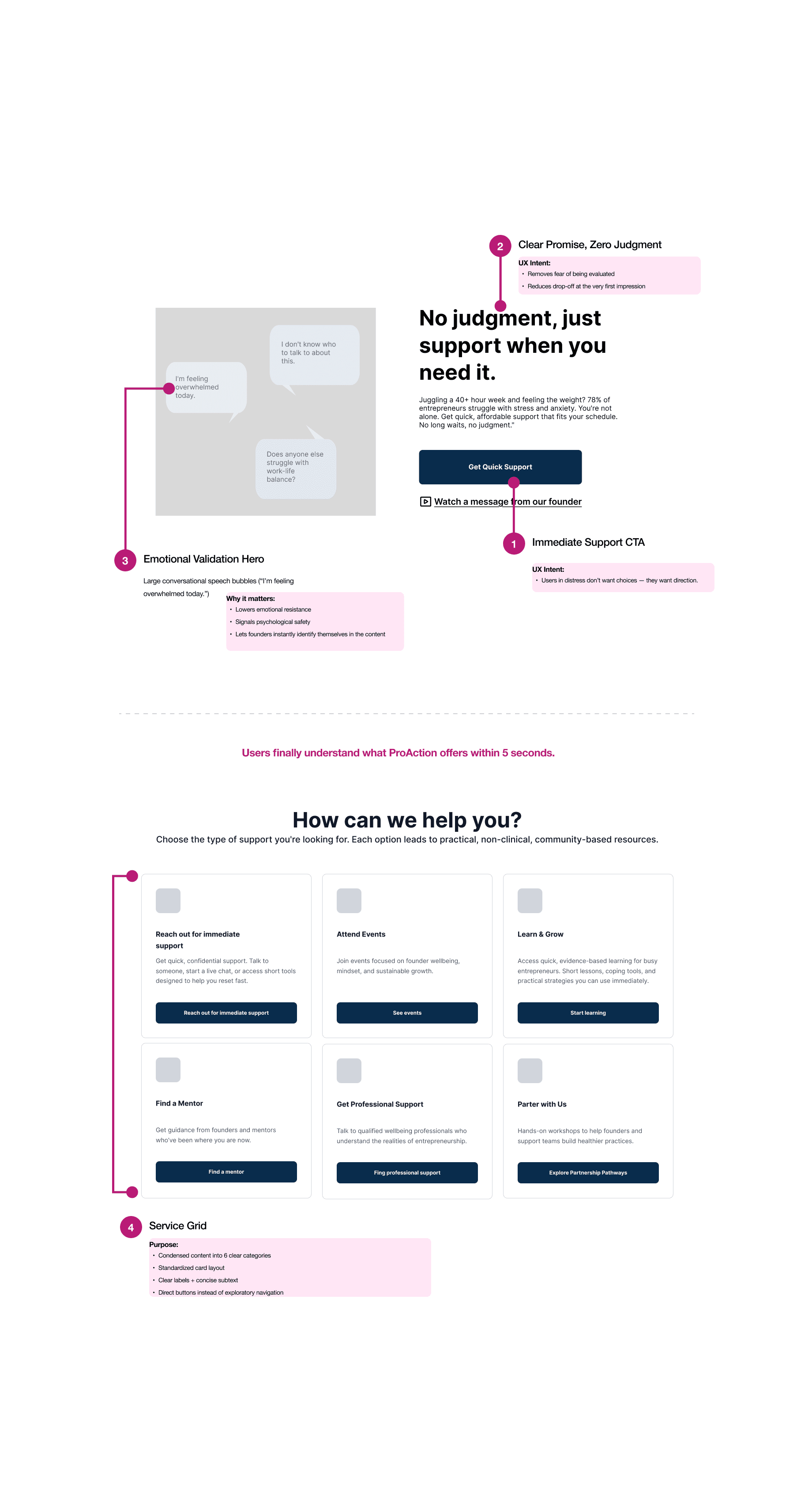 In the original design, ProAction offered a wide range of features spread across eight different pages. On paper, it looked comprehensive. But in testing, users spent nearly ten minutes clicking through the site only to ask the same question at the end: