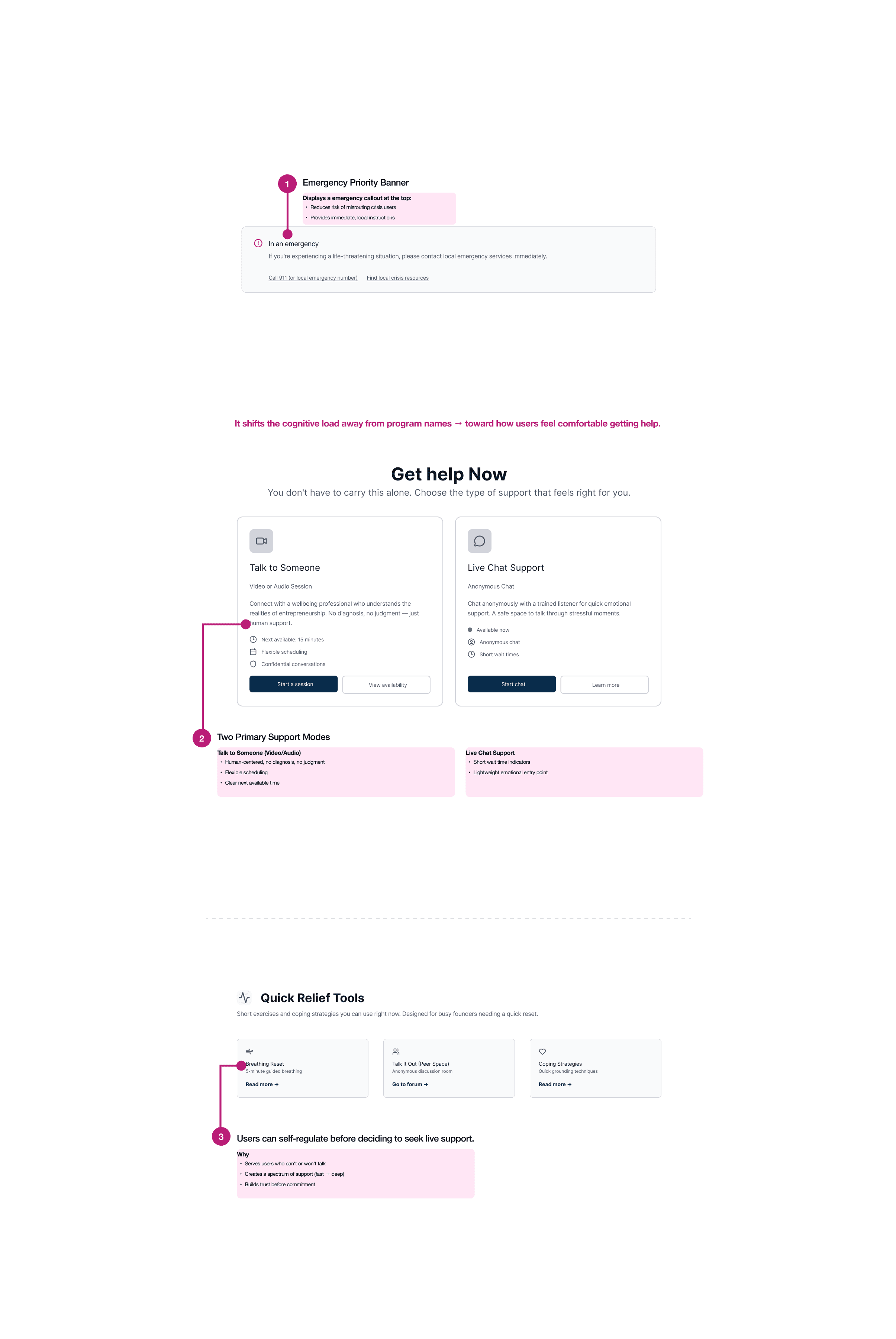 Rather than categorizing information by internal programs and departments, we organized it around what the user needs to feel at each moment: overwhelmed, curious, hesitant, ready, or not ready yet.