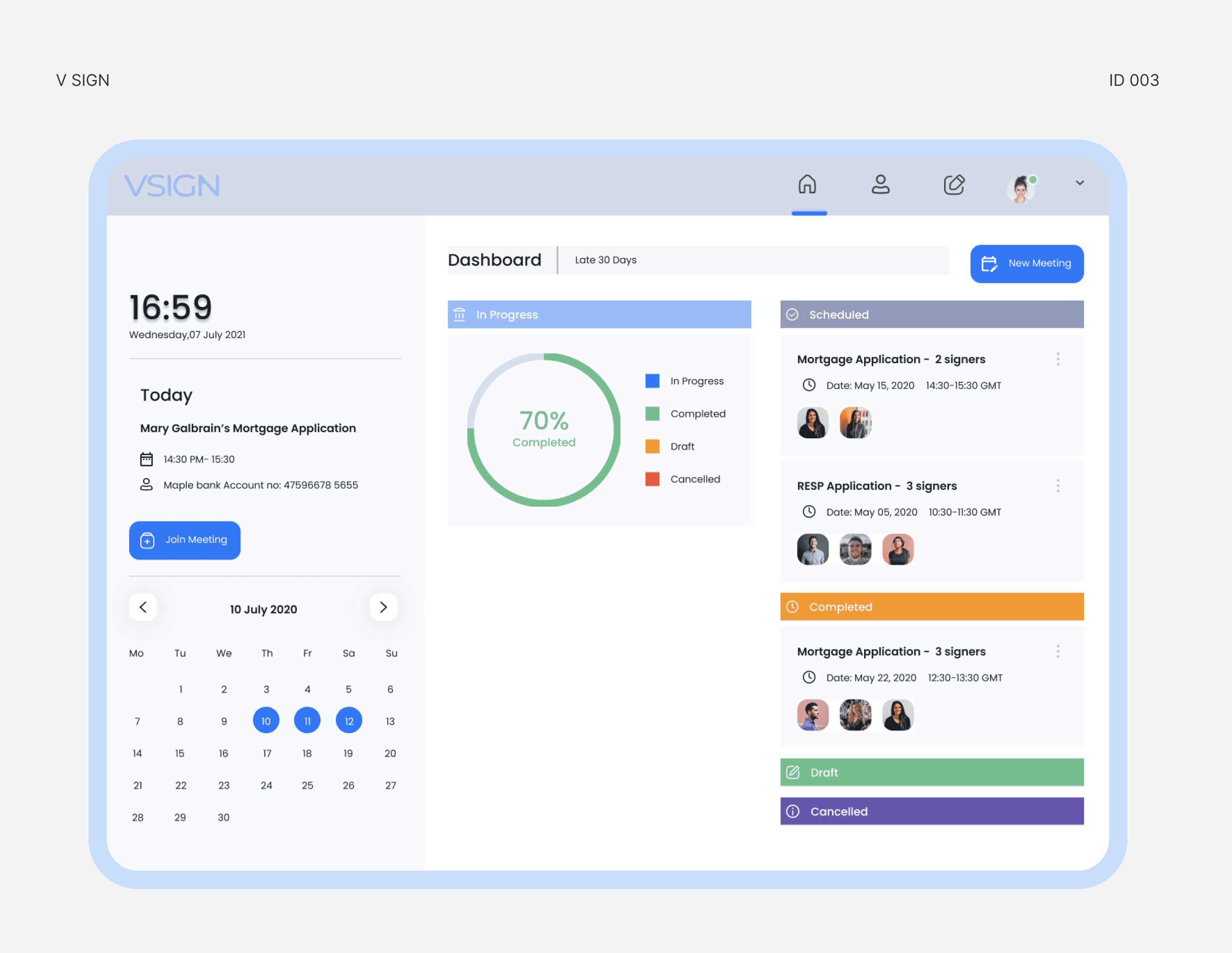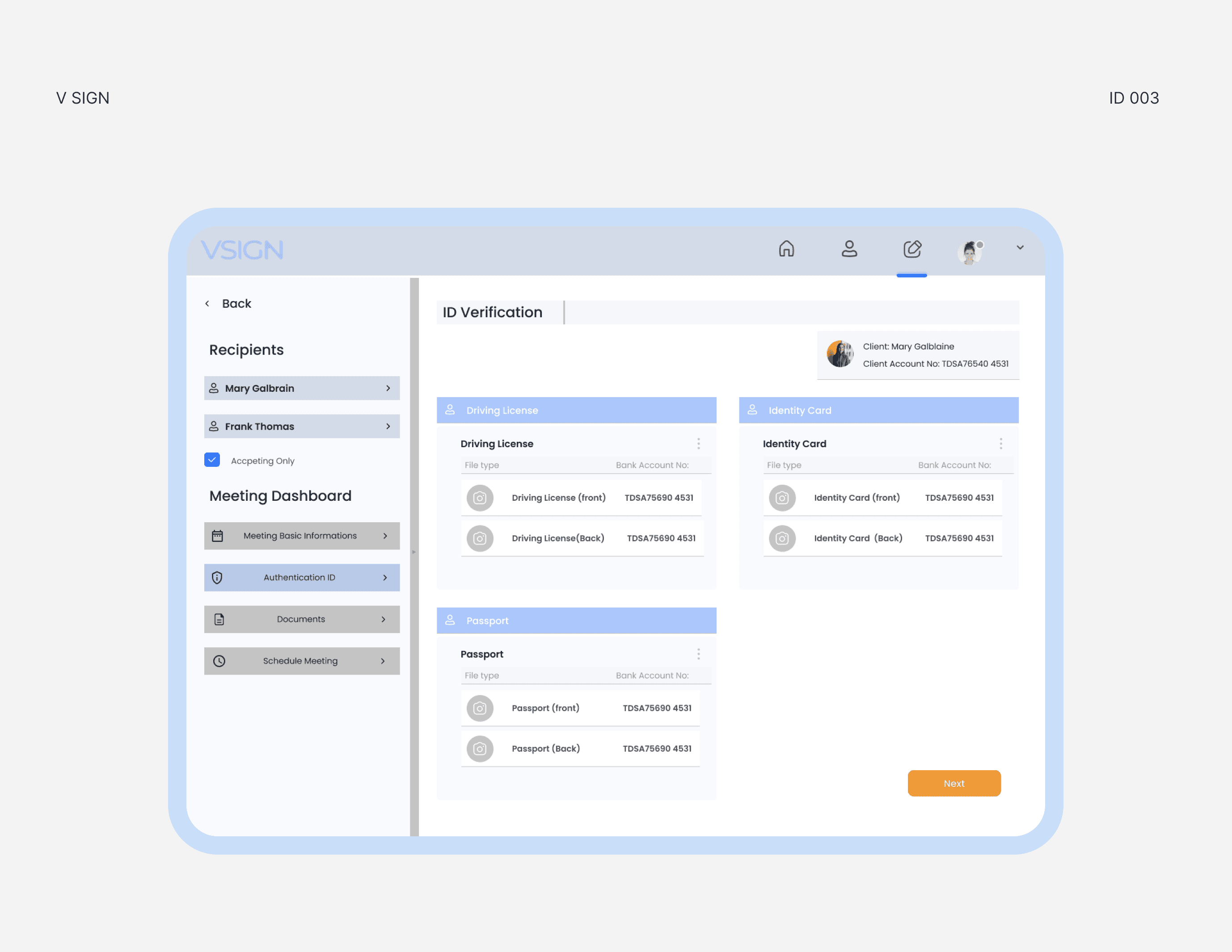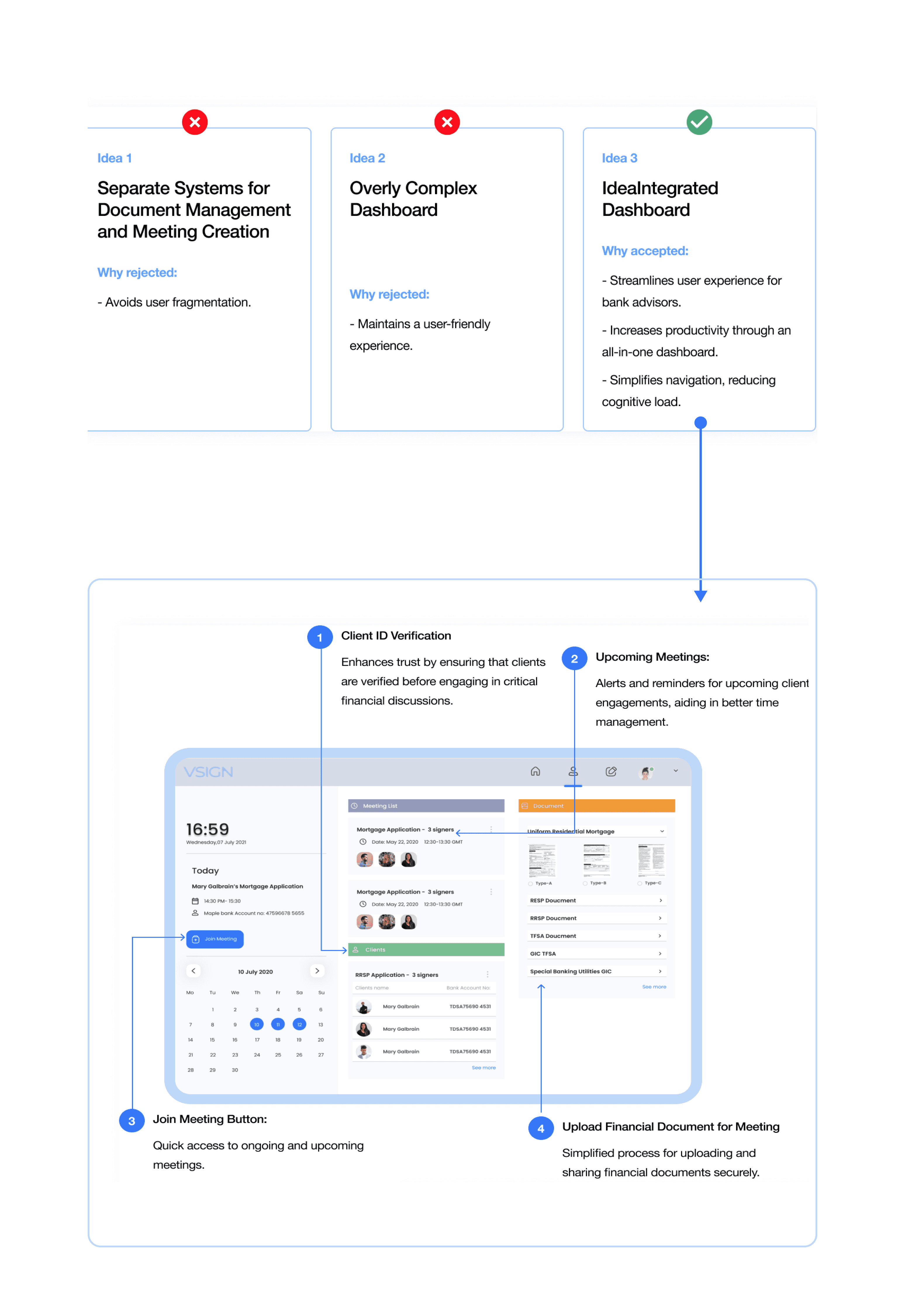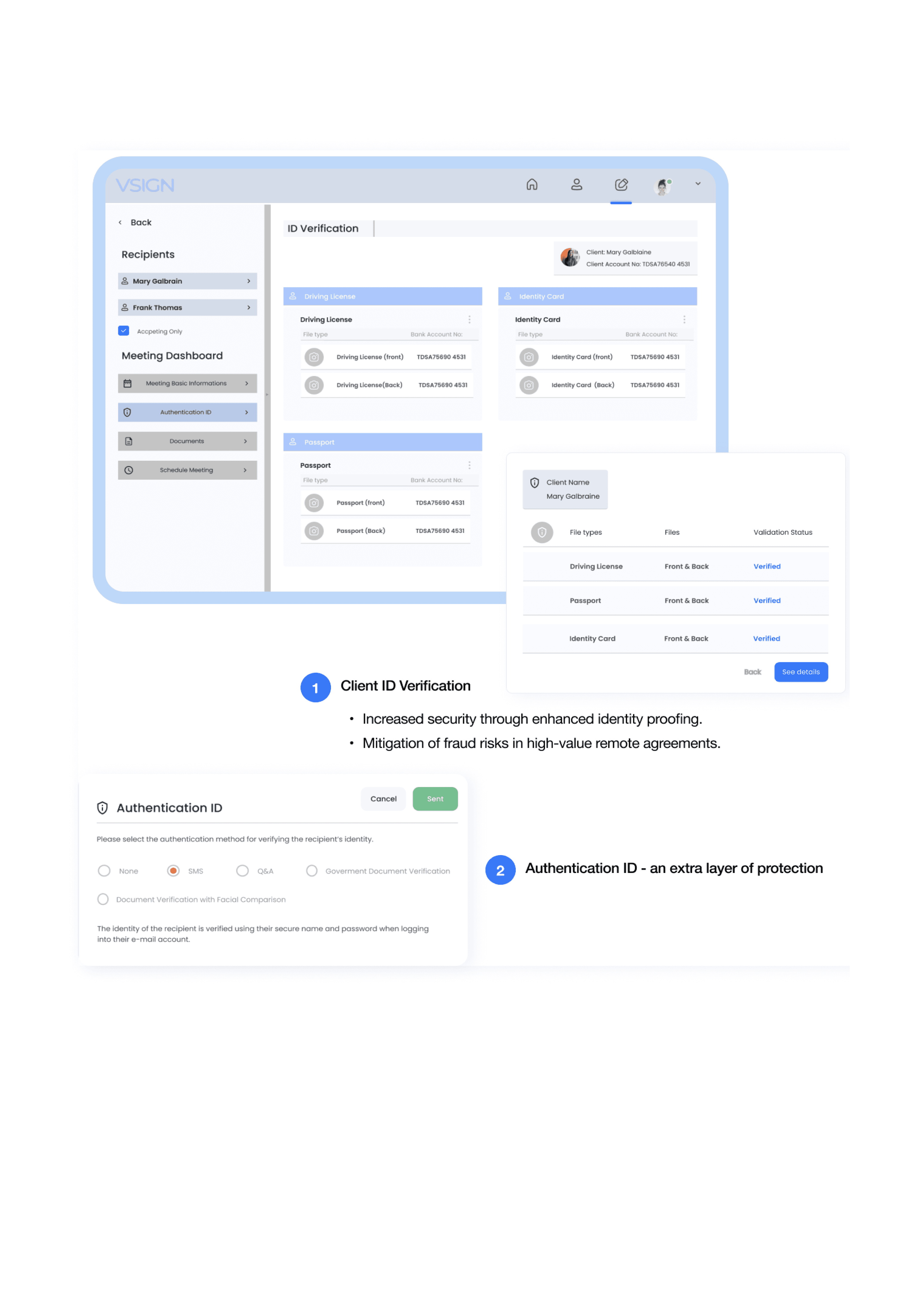 ➡️ For Bank Advisors, Vsign includes login, a financial dashboard, and e-signature tools for scheduling meetings, sharing documents, and validating IDs.